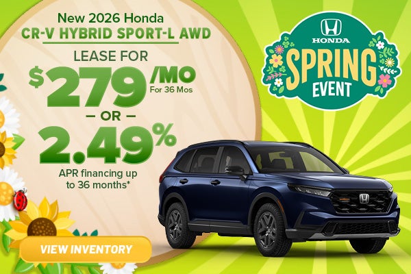 Advertised 36-month lease payment based on MSRP of select new 2026 Honda CR-V Hybrid Sport-L AWD models (STK# 60547) available on approved credit through Honda Financial Services. $3,499 down payment, no security deposit required. All payments plus tax, title, license, $377.63 doc fee, $35 electronic filling fee, and first payment. Must qualify for Loyalty or Conquest. Lessee responsible for maintenance, excessive wear/tear, and up to 20¢/mi. over 10,000 miles/year. 2.49% APR for up to 36 months for well-qualified buyers. Example: 10% down payment. 36 monthly payments of $28.86 per $1,000 financed. Not all buyers will qualify. Higher financing rates apply for buyers with lower credit ratings. Actual down payment may vary. Dealer sets actual prices. See participating dealer for complete details. Offer expires 03/31/2026.