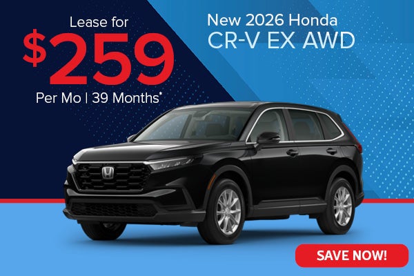 *Advertised 39 month lease payment based on a 2026 Honda CR-V EX with MSRP of $36,100, STK# 60745. Available on approved credit through Honda Financial Services. Offer excludes accessories. $3499 down payment, no security deposit required. Lessee responsible for maintenance, excessive wear/tear and up to 20¢/mi. over 10,000 miles/year. Down payment may vary. All payments plus tax, title, license, $367.70 doc fee, $35 ERT fee and first payment.Offer expires 02/02/2026.