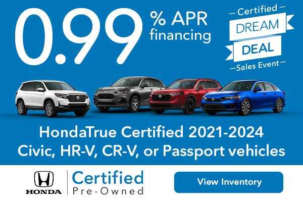 0.99% APR financing available on new HondaTrue Certified 2021-2024 Civic, HR-V, CR-V, or Passport vehicles for well-qualified buyers through Honda Financial Services. Example: 10% down payment. 36 monthly payments of $28.20 per $1,000 financed. Not all buyers will qualify; higher financing rates apply for buyers with lower credit ratings. Offer excludes tax, title, license, registration, options, and $377.63 dealer doc fee and $35 electronic filing fee. Actual down payment may vary. Dealer sets actual prices. See participating dealer for complete details. Offer expires 03/31/2026.